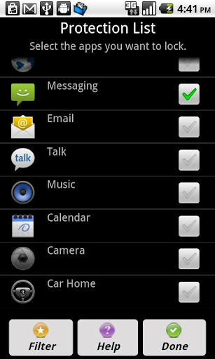 App Protector can lock any application on your phone: SMS, Message, Gmail, Photo, Gallery, Market..any app u choose. You can choose to only lock sensitive apps, while leave other apps unlocked. No more worry when show your phone to friends.